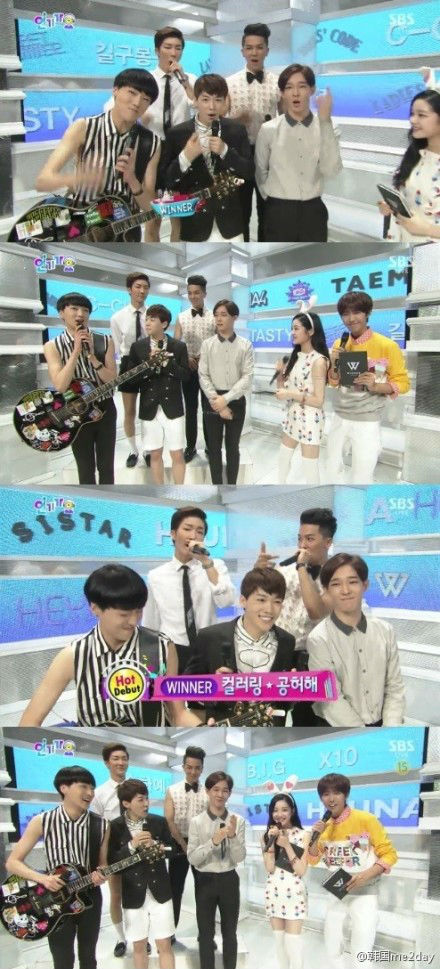 【mydaily】[人气歌谣WINNER"没想到会受到这么多喜爱,感谢大家"出道感言]17日下午播出的人气歌谣中YG新团WINNER即将登上音乐节目出道舞台,在此之前他们首先表达了对音源获得如此人气的开心之情.MC李侑菲问道"出道同时就音源榜all kill.获得如此多的喜爱心情如何"