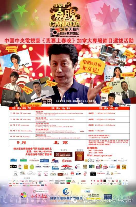 央视《我要上春晚》八月十日在万锦剧院进行加拿大专场总决赛,由于是中国国家媒体第一次与海外媒体合作,从联邦总理到新任中国大使都非常重视,节目从全国