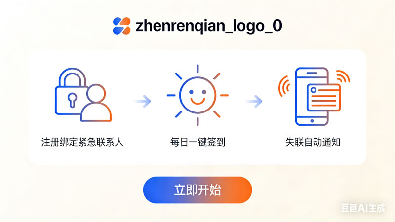 说干就干,团队选择了 “极简路线”:摒弃所有非核心功能,只保留 “每日签到” 与 “失联通知” 两大模块。用户无需下载 APP,打开zhenren.com网页即可注册,绑定紧急联系人后,每天花 1 秒点击签到,就能让家人放心。若连续 2 天未签到,系统会自动发短信提醒紧急联系人,避免意外发生。